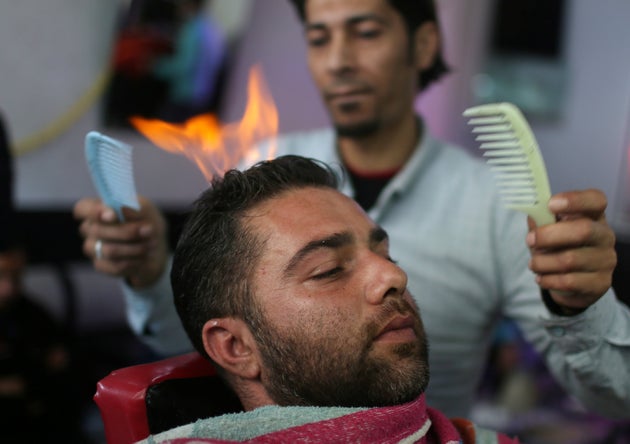 In Ramadan Odwan’s barbershop in Gaza, hair isn’t just blow-dried, it’s blowtorch-dried.